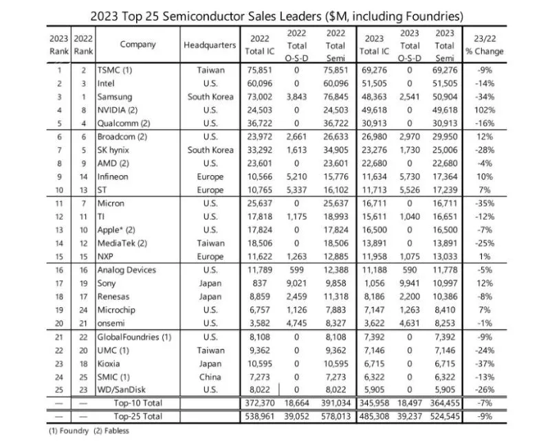 Le Top 25 de 2023 comprend treize fournisseurs basés aux États-Unis, trois en Europe, trois au Japon, trois à Taïwan, deux en Corée du Sud et un en Chine. Pour figurer sur cette liste, un chiffre d’affaires annuel d’au moins 5,9 milliards de dollars était requis. Bien qu’aucun nouvel entrant n’ait été intégré, des changements significatifs ont été observés, notamment la montée en puissance de TSMC. De plus, Nvidia a enregistré la croissance la plus remarquable (+102%), se hissant à la quatrième place du classement avec des ventes de 49,6 milliards de dollars, grâce à l’essor de ses ventes dans les processeurs d’intelligence artificielle.