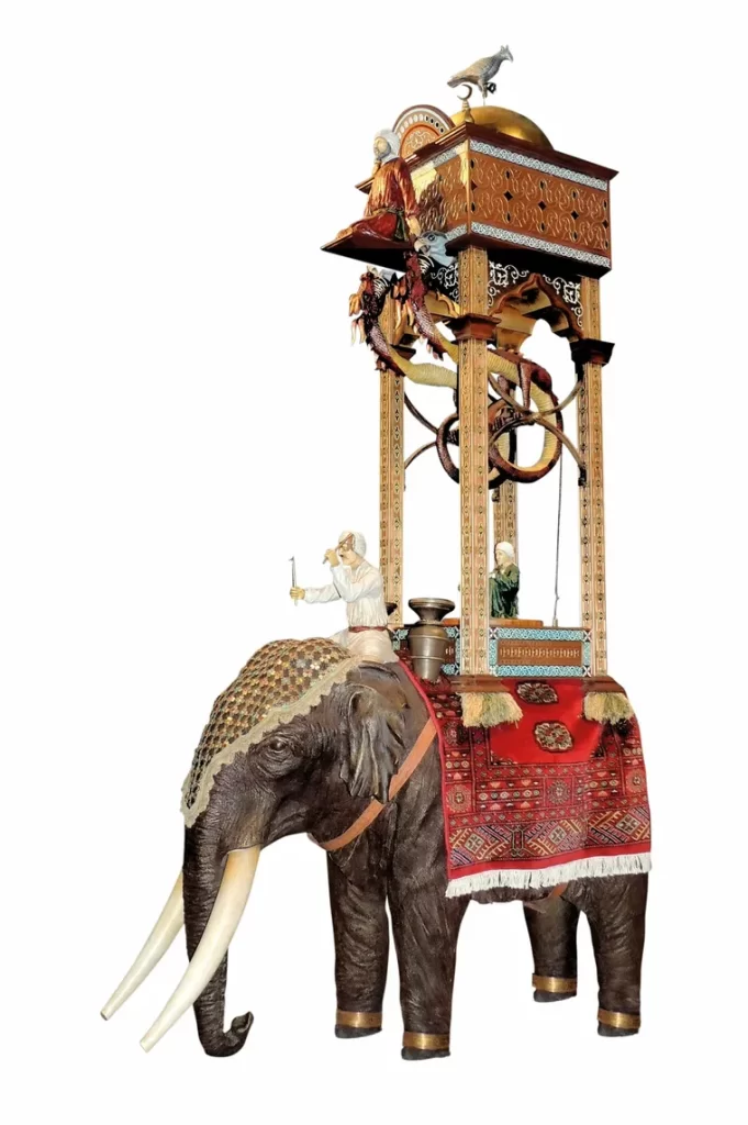 Al-Jazari est l’auteur du célèbre Kitab fi Ma’rifat al-Hiyal al-Handasiya (Livre de la connaissance des procédés mécaniques), un ouvrage publié en 1206. Ce livre est une encyclopédie des inventions mécaniques où il décrit en détail plus d’une centaine de ses créations, accompagnées de schémas précis et d’instructions pour leur construction. Cette méthode de documentation méticuleuse, rare pour son époque, a permis à ses idées de perdurer à travers les siècles.