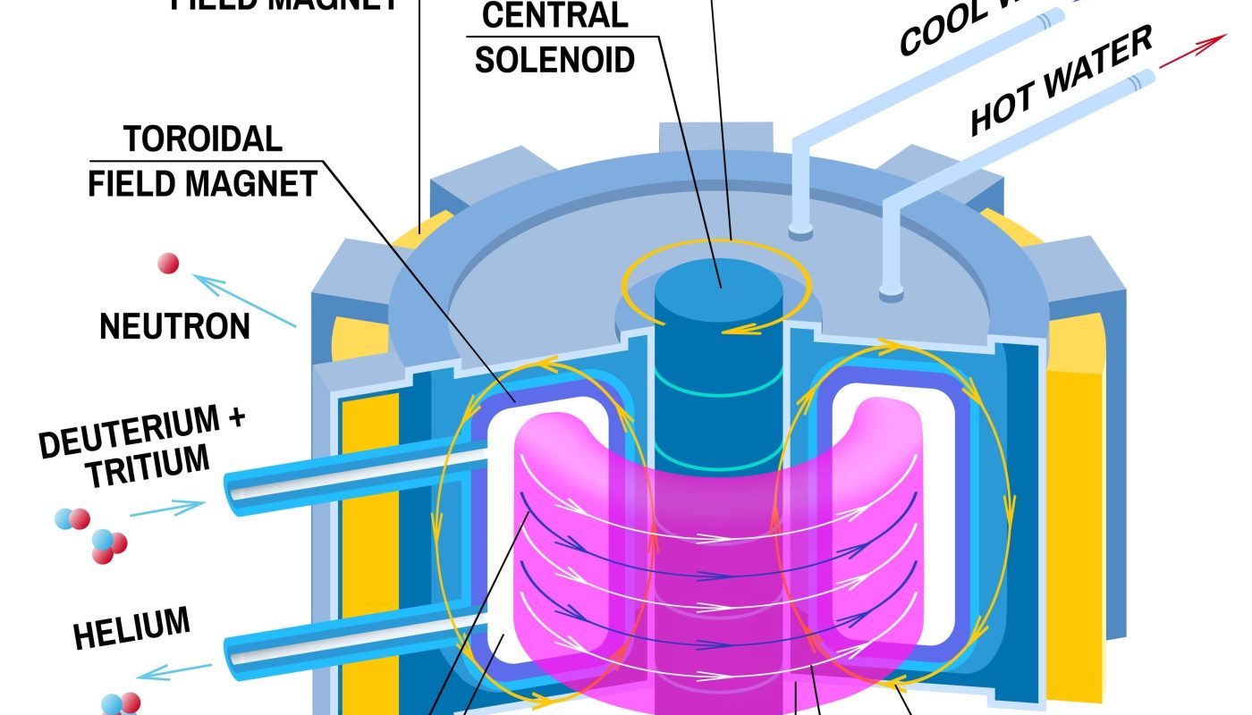 Un tokamak est une machine en forme de tore (anneau/doughnut) qui utilise d’intenses champs magnétiques pour confiner un plasma — un gaz ionisé, quatrième état de la matière — à des températures extrêmes (plus de 100 millions de degrés Celsius).